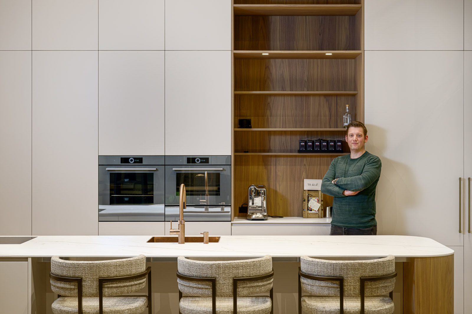 Met roots in keukeninterieurbouw bedenken en fabriceren de vakmensen van Elise Meubelen maatwerk tijdloze meubelen. Innovatie en ambacht gaan er hand in hand en alleen het beste is goed genoeg. Het bedrijf is grensverleggend in design, technologie en functionaliteit. Kenmerkend zijn het mooie, verrassende lijnenspel, perfecte verhoudingen en elegantie. “Hierdoor vormen de meubels een natuurlijk geheel met de ruimte”, vertelt Roel Bomers, die samen met zijn vader en broer eigenaar is van het bedrijf. “De geselecteerde materialen hebben een blijvende waarde. We sluiten geen compromissen en kiezen alleen voor de beste merken en materialen zoals het exclusieve V-Zug voor keukenapparatuur, de laden van Blum en HI-MACS® en Corian® Solid voor de wastafelbladen en keukenwerkbladen.”